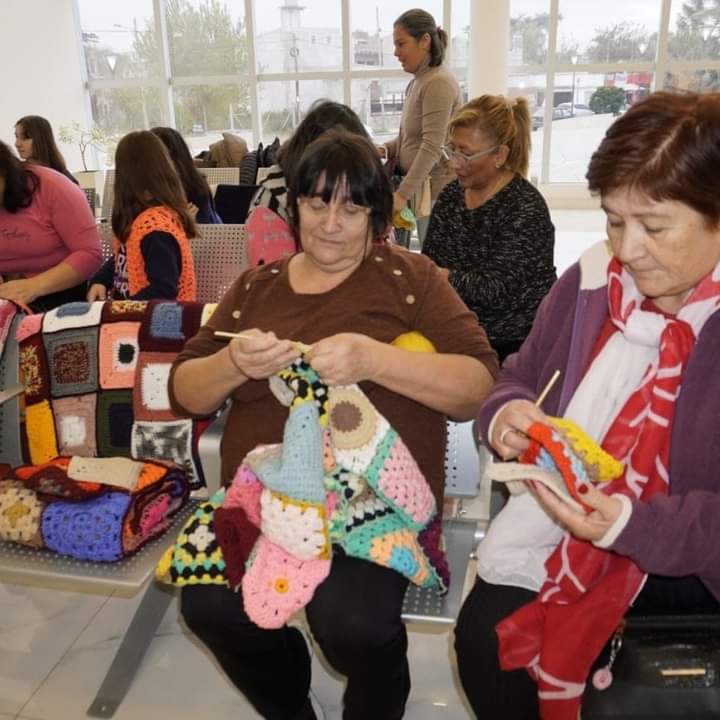 👉Miriam y Gisela, en conjunto con sus compañeras tejedoras del espacio “Tiempo para Crear” llevaron a cabo un trabajo con la comunidad de vecinas paceñas para brindarle a los pacientes que se realizan quimioterapia en el hospital Oncológico de #JoséCPaz mantas tejidas.