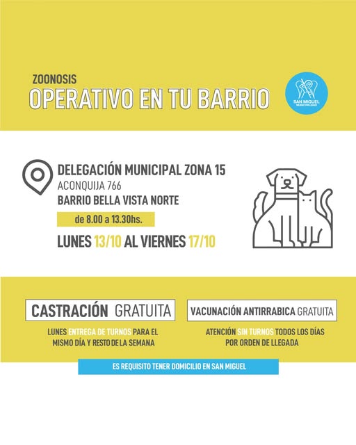 La Municipalidad de San Miguel continúa acercando servicios de salud animal a los vecinos con un nuevo Operativo de Zoonosis que se desarrollará del lunes 13 al viernes 17 de octubre, de 8 a 13.30 hs, en la Delegación Municipal Zona 15, ubicada en Aconquija 766, Barrio Bella Vista Norte.